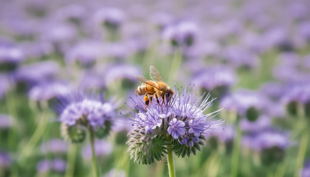La phacélie est une plante mellifère majeure. Ses fleurs abondantes attirent abeilles, bourdons et autres pollinisateurs. La Ligue pour la Protection des Oiseaux Champagne-Ardenne (2025) note qu’un hectare de phacélie peut produire jusqu’à 1000 kg de miel très parfumé, tout en attirant une diversité d’insectes bénéfiques comme bourdons, papillons et coléoptères. Ces insectes favorisent également la pollinisation des cultures avoisinantes.